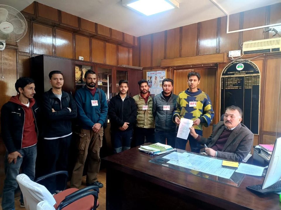 एस एफ आई ने आगे बात रखते हुए कहा कि हिमाचल प्रदेश विश्वविद्यालय के अंदर जितने भी यहां दुकान है इन दुकानों के अंदर खाने की गुणवत्ता को लेकर बहुत बड़ा सवाल है लगातार छात्र दुकानों में खाना खाने से बीमार होते जा रहे हैं लेकिन हिमाचल प्रदेश विश्वविद्यालय के शोर कोई भी ध्यान नहीं है लगातार इन दुकानों के अंदर खाने की गुणवत्ता के साथ खिलवाड़ किया जा रहा है और अधिक से अधिक मुनाफा कमाने का धंधा दुकानदारों के द्वारा चलाए जा रहा है। एसएफआई ने कुलसचिव को ज्ञापन सौंपते हुए प्रशासन से अनुरोध किया कि इन मांगों पर शीघ्र, ठोस और सकारात्मक कार्रवाई की जाए। एसएफआई ने यह भी स्पष्ट किया कि यदि प्रशासन इन मांगों को गंभीरता से नहीं लेता, तो SFI संवाद, पब्लिक मीटिंग्स और आंदोलन भी करेगा ।