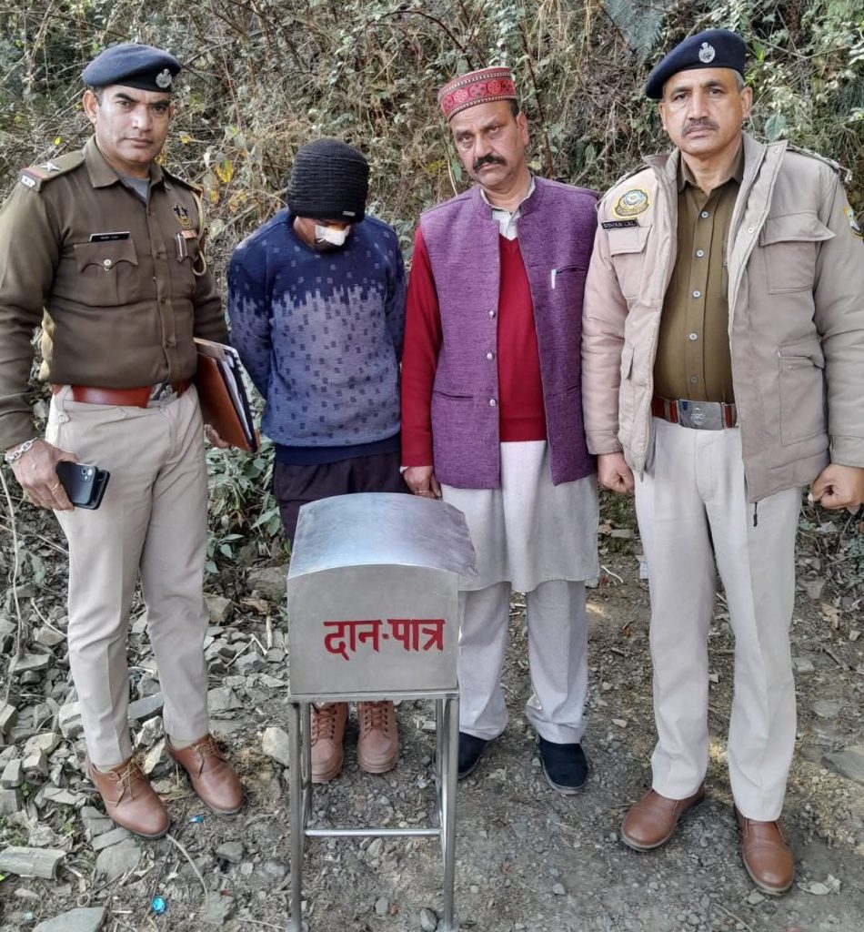 थाना पूर्व (PS East) में अभियोग संख्या 16/2026 दिनांक 23.02.2026 को धारा 303(2) भारतीय न्याय संहिता (पूर्व धारा 379 आईपीसी) के अंतर्गत मंदिर प्रबंधन की शिकायत पर मामला दर्ज किया गया। शिकायतकर्ता के अनुसार 23 फरवरी की प्रातः लगभग 5:30 बजे वह मंदिर पहुंचे और दान पेटी को मंदिर के अंदर से निकालकर मुख्य द्वार के बाहर रखकर पूजा-अर्चना करने लगे। करीब 6:30 बजे जब वह बाहर आए तो दान पेटी मौके से गायब पाई गई। इसके बाद तुरंत पुलिस को सूचना दी गई।सूचना मिलते ही थाना पूर्व शिमला की टीम ने त्वरित कार्रवाई करते हुए जांच शुरू की और संदिग्धों से पूछताछ की। तकनीकी साक्ष्यों व स्थानीय सूचना के आधार पर पुलिस ने जय प्रकाश (31 वर्ष) निवासी गांव फागू, तहसील शिलाई, जिला सिरमौर को गिरफ्तार कर लिया। जांच के दौरान चोरी हुई दान पेटी गांव कुम्हाली (कुसुम्पटी वन क्षेत्र) के समीप से बरामद की गई। आरोपी के कब्जे से नकद राशि भी बरामद की गई है।
