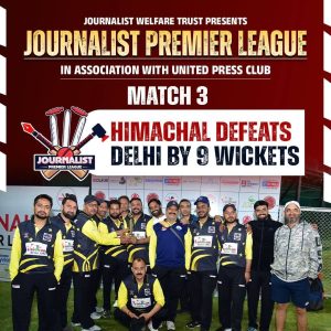 जवाब में लक्ष्य का पीछा करने उतरी हिमाचल मीडिया वॉरियर्स की टीम ने तूफानी अंदाज में बल्लेबाजी करते हुए मात्र 6 ओवर में 1 विकेट खोकर लक्ष्य हासिल कर लिया। बल्लेबाजों ने मैदान के चारों ओर आकर्षक शॉट्स लगाकर मैच को एकतरफा बना दिया। इस लीग का सफल आयोजन यूनाइटेड प्रेस क्लब के अध्यक्ष अर्शदीप समर और वरिष्ठ पत्रकार मोहित प्रेम शर्मा के नेतृत्व में किया जा रहा है। आयोजक अर्शदीप समर ने बताया कि यह जर्नलिस्ट प्रीमियर लीग का पहला संस्करण है और इसे हर साल नियमित रूप से आयोजित किया जाएगा, ताकि पत्रकारों को एक साझा मंच मिल सके जहां वे खेल के जरिए आपसी जुड़ाव को मजबूत कर सकें।